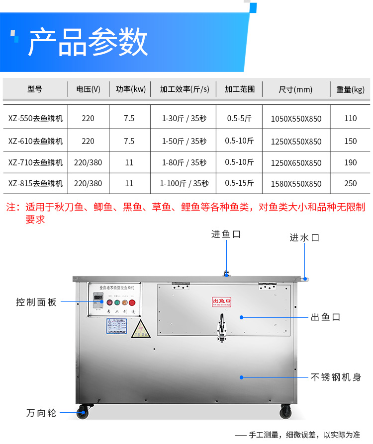 | 型號 | XZ-550去魚鱗機 | XZ-610去魚鱗機 | XZ-710去魚鱗機 | XZ-815去魚鱗機 |