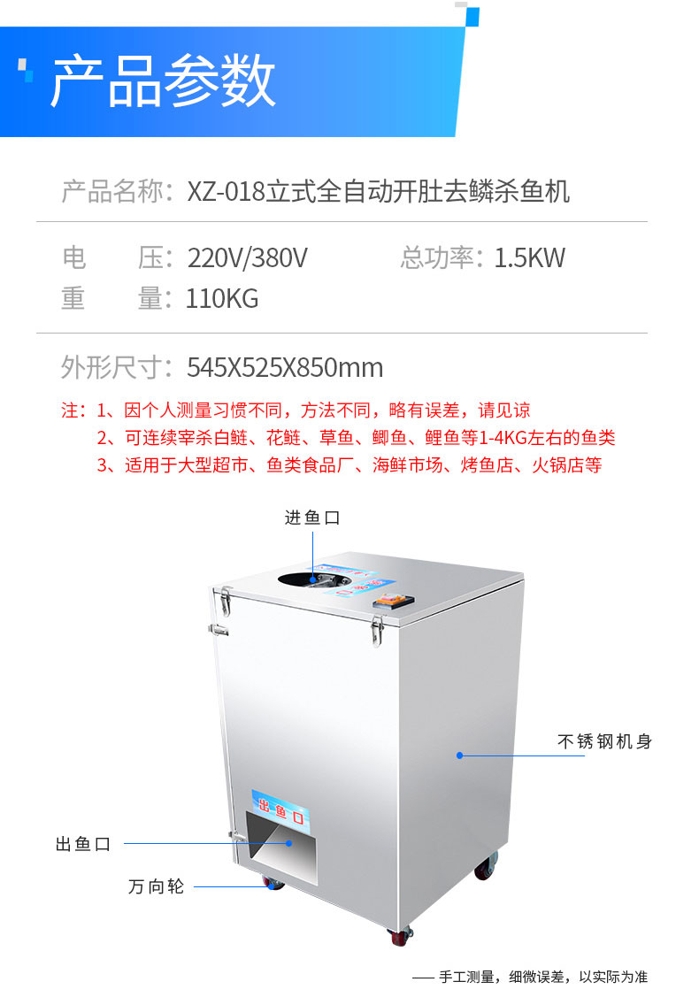 名稱開肚殺魚去鱗機(jī) 電源220/380V 功率1.5kw 產(chǎn)量 尺寸545×525×850mm 重量110kg 規(guī)格 其他